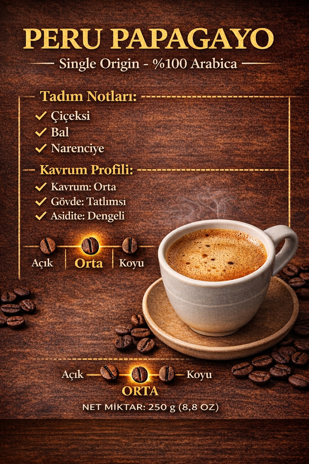 Peru Papagayo – SCA 87 Puan %100 Arabica Single Origin Espresso Filtre Çekirdek Kahve – 250 g