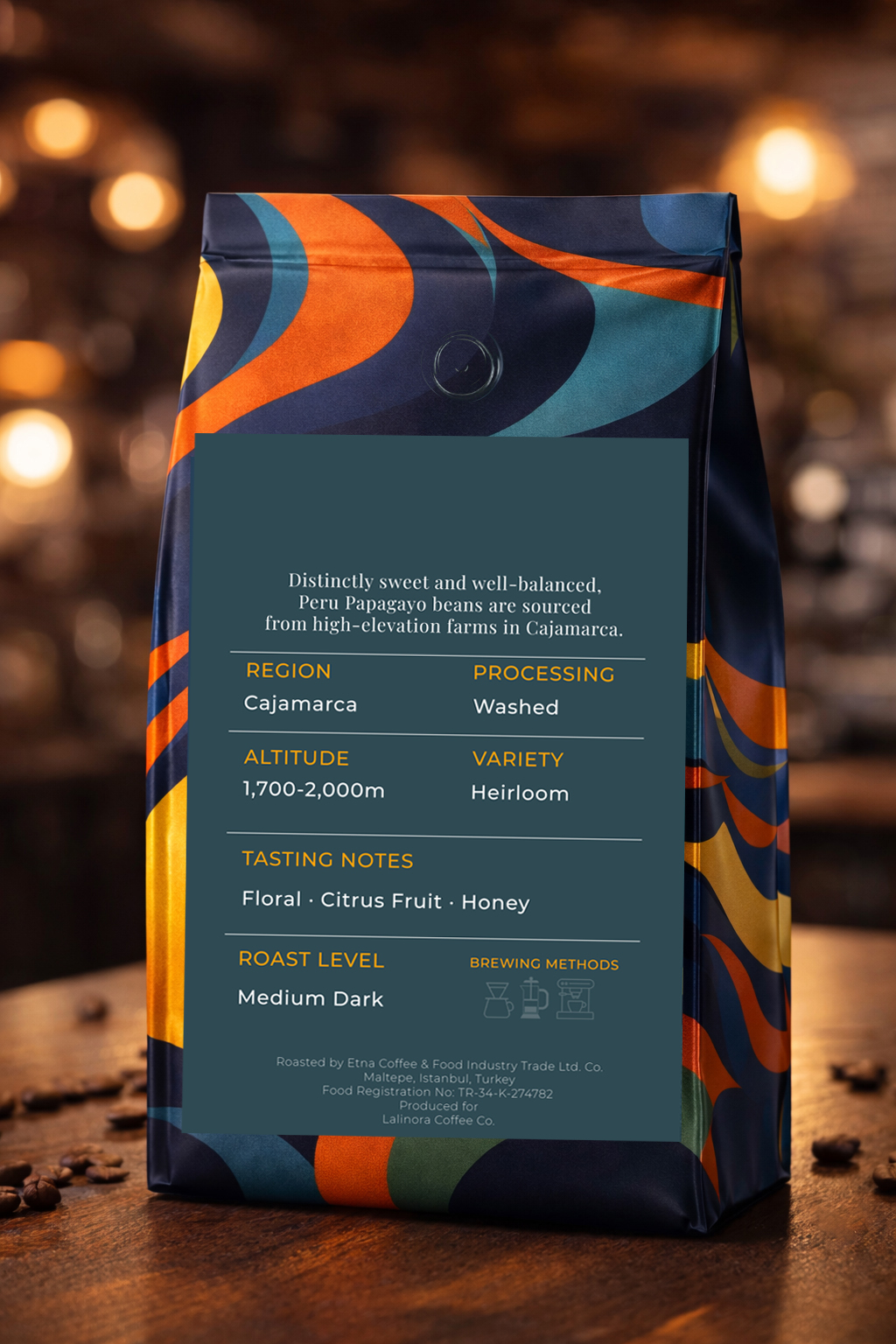 Lalinora Peru Papagayo Sca 87 Puan Sertifikalı Çekirdek Kahve, Peru’nun yüksek rakımlı Papagayo bölgesinden gelen, özenle seçilmiş %100 Arabica çekirdeklerden oluşan özel bir single origin kahvedir.; Yumuşak içimi, dengeli asiditesi ve zarif aromatik yapısıyla günün her saatine uyum sağlayan, rahat içimli bir profil sunar.; Doğal işlenmiş çekirdeklerin karakteri sayesinde tatlı ve parlak notalar ön plana çıkar.; Orta kavrum profili, kahvenin doğal lezzetini koruyarak hem filtre demlemelerde hem de manuel demleme yöntemlerinde ideal sonuç verir.; Tadım Profili Çiçeksi – Bal – Narenciye Yumuşak ve tatlımsı gövde Parlak ama dengeli asidite Aromatik ve ferah bitiş Günlük içime uygun dengeli karakter Kullanım Alanları Espresso, Filtre kahve V60, Chemex, French Press Ev tipi filtre makineleri Cold Brew